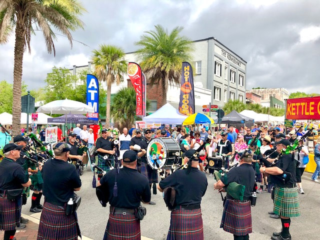 Bagpipes, Highland games, Celtic music, food vendors, and Scottish cultural celebrations in downtown Mount Dora.